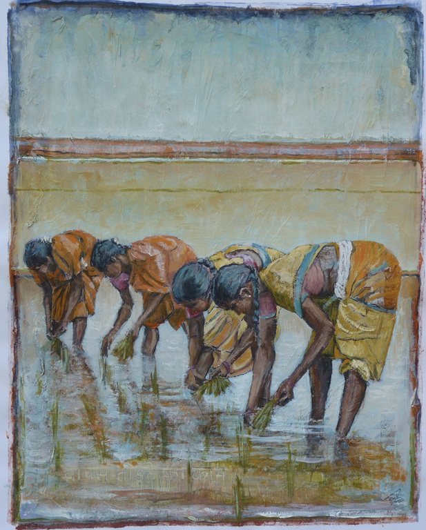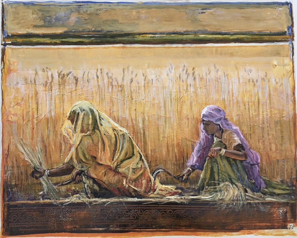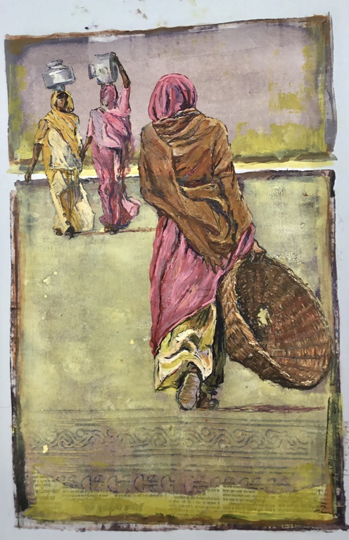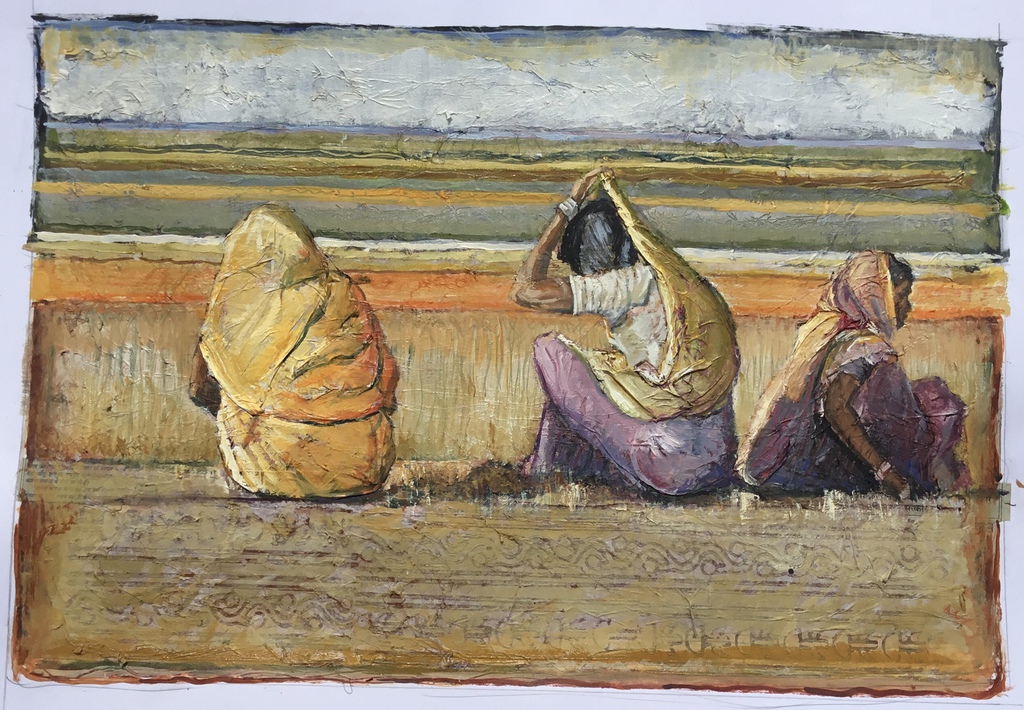 Women tending bullocks, sheep and goats form subjects for paintings as do women cutting wheat and transplanting rice . Back breaking work often with little shade with only the men using machinery. The diffused dusty light created by the movement of animals in the evening and the smoke from the burning of cow dung often creates wonderful atmospheric ,colourful backgrounds for paintings.